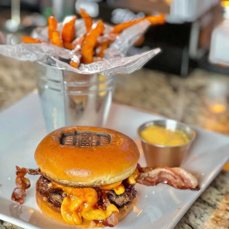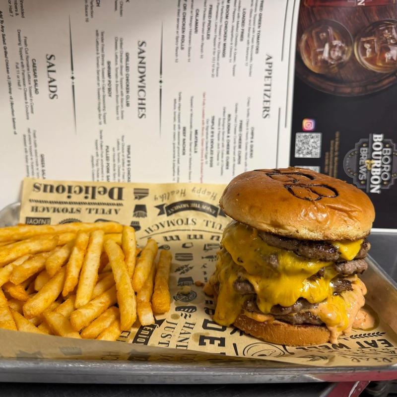 A half-pound Angus burger with thick-cut applewood smoked bacon, a fried mozzarella plank, caramelized onions, and our house triple B's BBQ sauce on a toasted brioche bun.