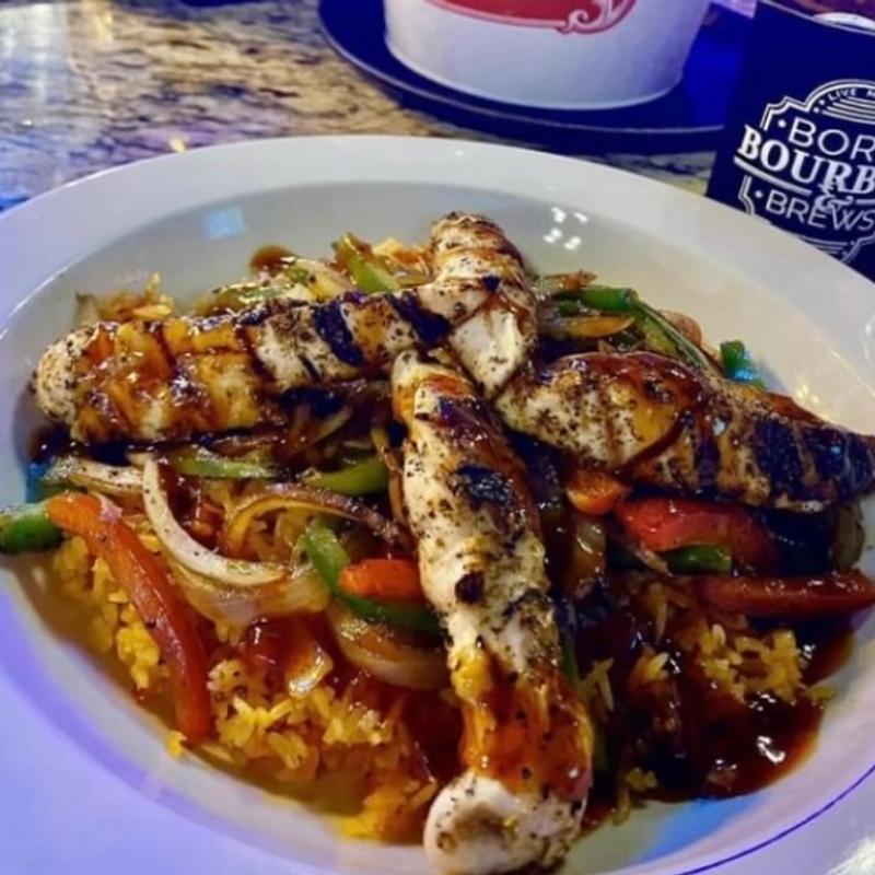 Grilled chicken tenderloins served on a bed of yellow rice, sautéed peppers, and onions, drizzled with a bourbon glaze.