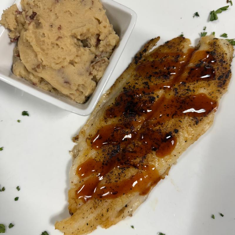 Blackened grouper glazed with our homemade bourbon sauce on the side.
