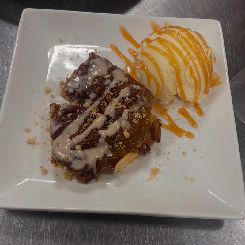 Topped with a scoop of vanilla bean ice cream and candied pecans, garnished with a bourbon caramel drizzle and sweet cream quenelles.